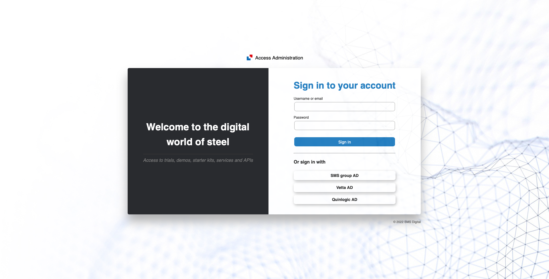 The user management and authorization are handled by the SMS SSO of SMS digital. It is either integrated into your company’s user management or works with a standalone authentication provider. If you do not have access yet, please your app administrator.